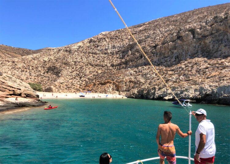 Rose: Στη Φολέγανδρο οι παραλίες που μπορείτε να επισκεφθείτε με το αμάξι είναι ελάχιστες. Στις υπόλοιπες παραλίες είτε θα πάτε με θαλάσσιο ταξί είτε θα πρέπει να περπατήσετε αρκετά από την Αγκάλη ή από τη Χώρα. Οπότε το να κάνετε μία θαλάσσια εκδρομή στην οποία θα δείτε κατευθείαν πέντε, έξι παραλίες, είναι ότι πρέπει για την πρώτη ή δεύτερη ημέρα της διαμονής σας στο νησί. Έτσι θα έχετε εικόνα για το ποιες παραλίες θα θέλετε να επισκεφθείτε ξανά.