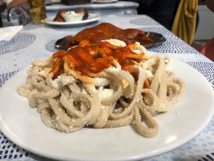Rose: Επίσης φάγαμε ματσάτα με κουνελάκι! Εξαιρετικό έχω να πω. H κοκκινιστή σάλτσα απίθανη, το κουνελάκι έλιωνε και για τα ματσάτα…τι να σας πω…. πρέπει να τα δοκιμάσετε. Από πάνω μπόλικο τριμμένο τυράκι. Τα σερβίρουν σε δύο χωριστά πιάτα, ώστε αν κάποιος δεν θέλει κρέας, μπορεί να φάει σκέτα τα ζυμαρικά με κόκκινη σαλτσούλα.