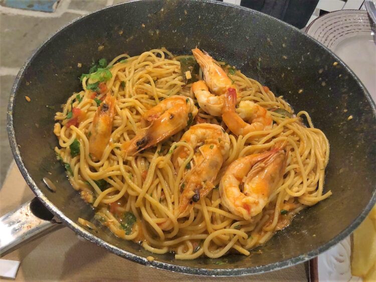 Elsa: η δε γαριδομακαρονάδα- η οποία σερβιρίστηκε σε ένα τηγάνι για να φάει ένας λόχος – ήταν τόσο νόστιμη θαλασσινή υποδοχή στο νησί. Ανάλαφρη σάλτσα, μεγάλες γαρίδες, σωστά βρασμένα μακαρόνια και διάφορα ταιριαστά μυρωδικά, έδεναν ένα πιάτο μοναδικό. Κυριαρχούσε η γαρίδα χωρίς να επικαλύπτεται από άλλες δυνατές γεύσεις.