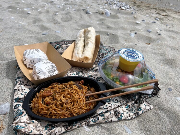 Rose: Πήραμε τα φαγάκια μας κατενθουσιασμένες σε τέλεια συσκευασία! Ότι χρειαζόμασταν για να απολαύσουμε το γεύμα μας on the way ήταν μέσα στη σακούλα. Ξύλινα μαχαιροπίρουνα και βεβαίως chopsticks για τα noodles μας. Όπως καταλαβαίνετε, ήταν μια υπέροχη έκπληξη όταν ανοίξαμε τη σακούλα με τα καλούδια στην παραλία.