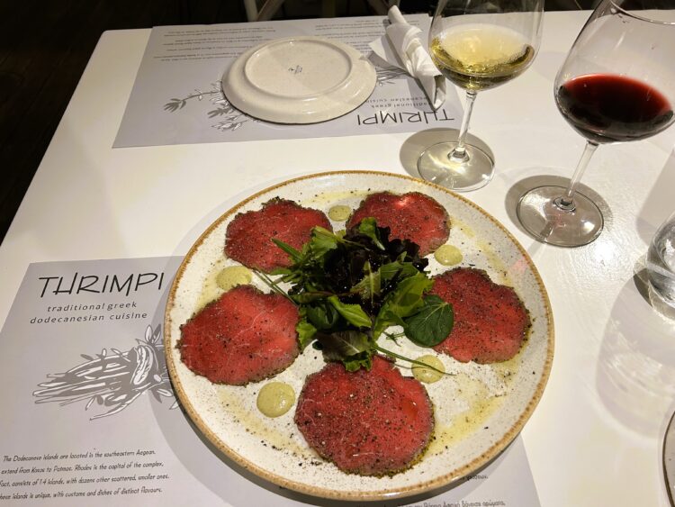 Rose: Βεβαίως να αναφέρουμε και το εξαιρετικό καρπάτσιο που φάγαμε στο Thrimpi. Λεπτοκομμένες φέτες πεντανόστιμου μοσχαρίσιου φιλέτου με βότανα, λαδάκι και λεμόνι. Ένα πιάτο που αγαπάμε πολύ και που, για μία ακόμη φορά, το φάγαμε στην Κάλυμνο εξαιρετικά εκτελεσμένο.